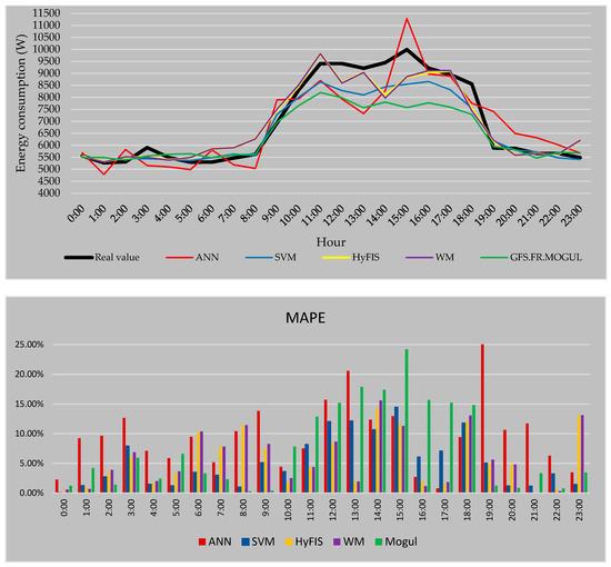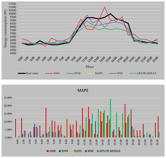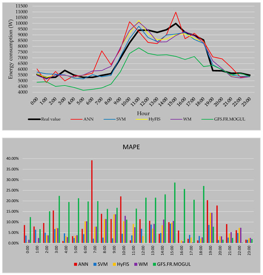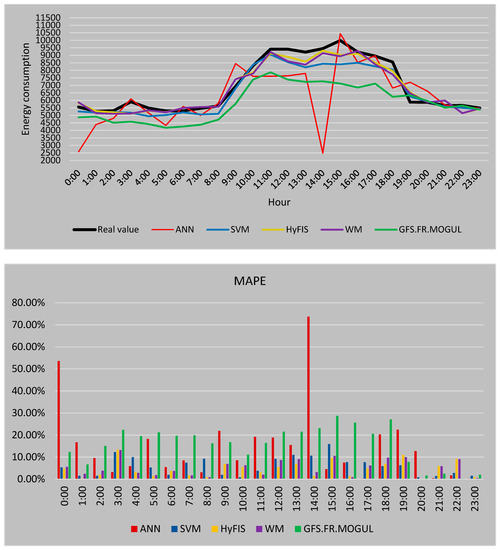 In Figure 12 the real consumption value of every hour is presented by the black line. As it is visible, during the peak hours of the consumption the predicted values are mostly lower than the real value. The MAPE is used to measure the accuracy of the forecasted values. For this strategy, the most reliable values by the average error of 4.93% are calculated by SVM followed by HyFIS with 5.81% and WM with 5.99%. Also, the GFS.FR.MOGUL by 7.45% error and ANN by 9.83% are the methods by the highest error in the case of the first forecasting strategy.