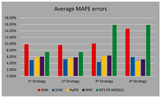 Figure 16 presents a comparison between the average MAPE error of the forecasting methods based on the four proposed forecasting strategies in this work.