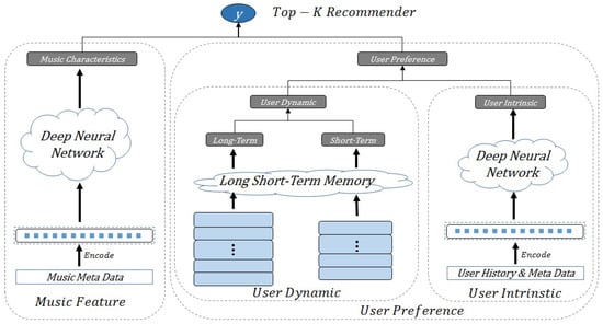 With the development of mobile internet, enjoying online music by mobile phones is affordable for most users. Users may open their phones and listen to music anywhere, anytime. Many music recommendation systems use collaborative filtering (CF) methods [,,]. CF methods, however, rely on explicit rating values to find similar users or items, while in music platforms, users listen to music but rarely rate the music. Although implicit feedback methods are alternative choices, these methods require careful parameter tuning [,]. All the methods cannot address the cold start problem. When new items or users appear, the corresponding model must be retrained to update the items’ or users’ profiles.