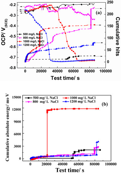 Figure 2b, except in the 1200 mg/L NaCl solution. Not only did the acoustic emission of the corrosion event depend on the corrosion stages, and also on the corrosion morphology and other factors, such as the propagation route of pits (i.e., go through the crystalline grain or boundary), but so did the energy of the AE. Although energetic AE signals in pitting normally correspond to the propagation [