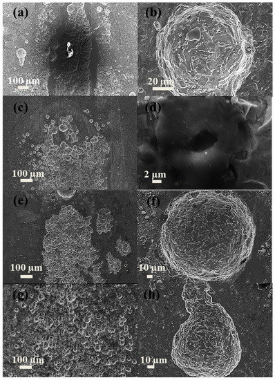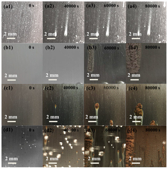 − concentrations at different time intervals of 0 s, 40,000 s, 60,000 s, and 80,000 s, respectively. The surface morphology monitoring experiments were conducted simultaneously with the OCP and AE measurements. After the experiments, the surface morphologies of pits after the removal of loosened corrosion products were observed by SEM, as shown in