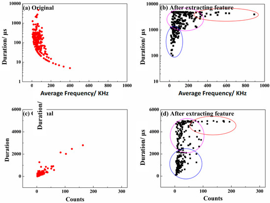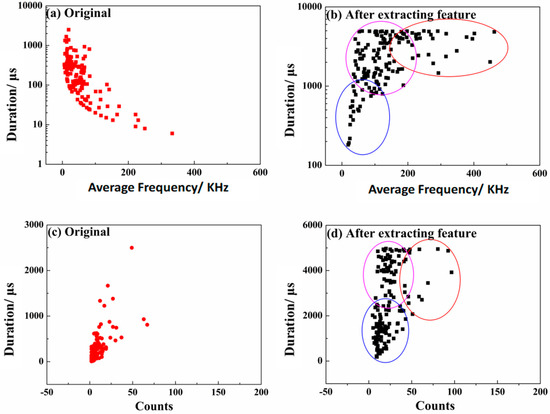 A function was established to input waveform information, time and system information including the maximum duration, hit definition time (HDT), hit lockout time (HLT), peek definition time (PDT), sampling frequency, and the threshold, to Matlab. Some AE parameters were used for the clustering analysis, for instance, the “count”, the “duration”, and the “average frequency”. The count of the AE event is the number of times the signal rises and crosses the threshold of the AE setup. The duration of the AE event is the time between the rising edge of the first count and the falling edge of the last count. The average frequency (Hz) was calculated from NAE/tAE to estimate the characteristic frequency of an AE event. These parameters were recorded by the AE acquisition system in-situ and extracted in Matlab after waveform processing, respectively.