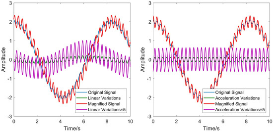 where is the amplification factor. The difference between linear and acceleration magnification in the 1D signal is illustrated in Figure 2. The red lines show the signal magnification results for factor . The purple curves show the magnified linear and acceleration variations of the 1D signal. Compared with the linear method, acceleration magnification handles only small motion and is more robust to large translational motions.