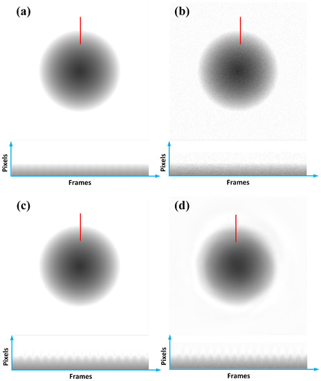 A simulation test is provided to illustrate the acceleration magnification result. From Figure 3a, a simple vignetting black circle, which has a diameter of 240 pixels, is programmed to vibrate in a sinusoidal manner with 0.2-pixel amplitude in the vertical direction. Figure 3c shows the magnified video image. Based on the comparison between the pixel time slices marked with red lines in Figure 3a,c, subtle vibration is successfully magnified in the reconstructed video file. In pixel time slices, the horizontal axis is the frame number, and the vertical axis is the intensity values cut from the red line in the corresponding frame. Figure 3b shows the polluted black circle video that contains Gaussian white noise with variance 0.005, and the magnified result is given in Figure 3d. Benefiting from the temporal filtering process, noise in the reconstructed video frame is significantly reduced.