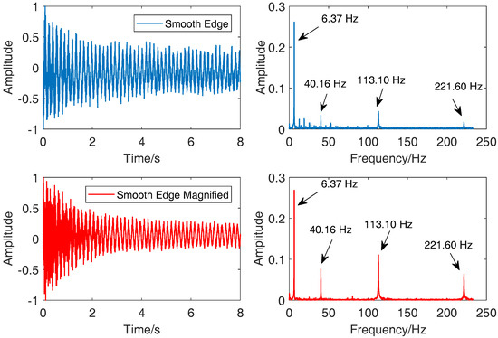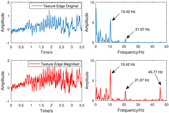 The employed Laplacian kernels in motion magnification were calculated by using finite element analysis [36]. The frequency spectra of the extracted waveforms before and after acceleration magnification are compared in Figure 10 and Figure 11. The SVD results indicate that the first two decomposed components took over 92% of the energy in the analysis matrices, so the rest of the singular values were zeroed in the final low-rank approximation signals. The waveforms extracted from the magnified videos contained high-frequency vibrations. Three obvious peaks (10.42 Hz, 21.07 Hz, and 45.77 Hz) were found in the magnified smooth clean edge and the textured edge. Higher order peaks (21.07 Hz and 45.77 Hz) were not clearly found in the signals extracted from the original video files. The used Laplacian kernels and magnification factors are given in Table 2. The results confirm the successful enhancement of low-level vibration signals in the magnified videos.