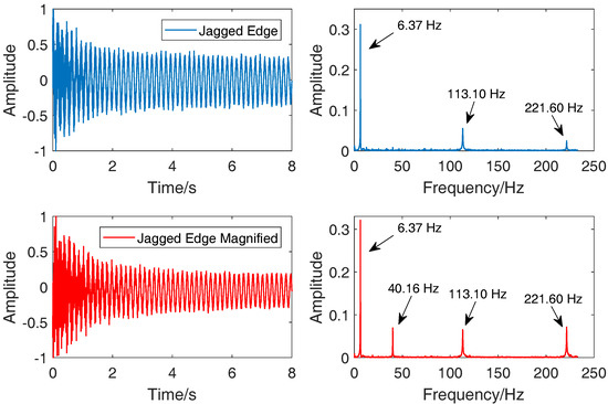 The captured video file was first handled by the phase-based acceleration magnification algorithm. Laplacian kernels in motion magnification were calculated according to the theoretical resonant frequencies that were obtained by using Euler–Bernoulli beam theory. Two subimage areas were then selected within the red (the jagged side) and blue (the smooth side) rectangles to extract deviation signals. The size of the selected two subimages was 300 × 30 pixels. The analysis matrix can be generated with deviation variation signals in all frames calculated. The SVD results indicate that the signals corresponding to the first two singular values took over 90% of the energy in the obtained analysis matrix. The rest of the components in the analysis matrix were considered to be noise and ignored in the low-rank approximation matrix. The waveforms and frequency spectrums of the vibration signals from the smooth side and jagged side of the saw blade are shown in Figure 6 and Figure 7.