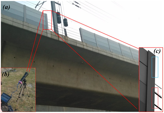 A noise barrier is an exterior structure designed to protect inhabitants of sensitive land use areas from noise pollution. The noise barriers are installed on both sides of the CRHtrain railway bridge to mitigate noise from the railway when a train is passing by. These platy structures usually suffer from strong suction induced by the CRH train under practical working conditions. Wind pressure when a high-speed train passes by can cause harmful vibrations to the noise barriers and decrease the designed service life. Figure 8 shows the experimental setups of the noise barrier vibration test. The field test was conducted near the KunShan railway station, which is an important railway hub in East China. The height of the viaduct is about 12 m, and traditional contact sensors are difficult to install.