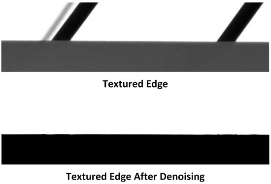 The selected analysis area is transformed from the RGB color space to grayscale because the deviation extraction algorithm only works on image intensities. From Figure 1b, two subimages within the yellow rectangles are selected as the regions of interest (ROIs). The size of the ROIs is 480 × 50 pixels, and the red and blue lines within the ROIs represent the idealized straight-line segments that are identified using the line segment detector. In reality, these detected line elements are not perfectly straight-lines and contain unnoticeable subtle vibrations. During the analysis, the detected smooth and jagged sides are considered as idealized straight-lines for the convenience of the following sampling process. We consider the direction of the idealized straight-line segments as the x axis, and the edge profiles are then sampled strictly perpendicular to it. The sampling direction (y axis) is marked with green arrows in Figure 1b. Figure 1c shows the output deviation extraction signals of the jagged edge and the smooth edge without performing any denoising process. The unnoticeable cyclical jagged shape marked with a blue line is extracted successfully from the saw blade subimage. The amplitude of the deviation signal on the smooth side is quite small (less than 0.1) and can be observed as a smooth line.