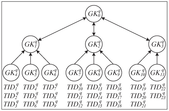 When a cargo shipment with a tag collection is delivered to the recipient , the reader requests the verifier to establish a secure multicast connection to ensure that the generated grouping proofs are in accordance with those on the recipient’s reader and that the message can be transmitted to tags in . Accordingly, the verifier generates a k-ary group key with a subtree height difference of ≤ 1() by using the secret key , where is shared between the verifier and the tags . In summary, the group keys that can transmit messages to q tags in are defined as . Figure 1 shows an example of a 3-ary group key ( is the starting node) generated for a set of 23 tags; the group key is employed to encrypt the multicast messages transmitted to the tags numbered from to , and tags , , and can decrypt the multicast messages encrypted with the group key by using their own shared keys , , and , respectively. The! details of group key generation can be found in Yang and Xie’s proposed methods [17].