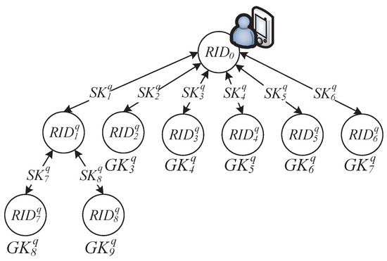 In this phase, the reader uses the distributed keys to encrypt the recipient’s identification code , ownership transfer request , timestamp , group key set for the child node reader , and tag verification code set , and then transmits the ciphertext until all leaf nodes are reached. For example, as shown in Figure 2, the reader first uses the key to encrypt , , , = , , , , and , and then transmits them to the reader , which will use the session key to decrypt the message, split and and, accordingly, encrypt , , , , , , , , , , and into separate messages by using the session keys and , and send them to the leaf node readers and .