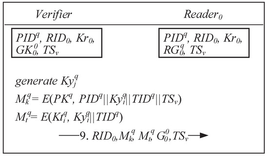 After receiving the transmitted message from the verifier, the reader proceeds to encrypt the message by using the session key along with and the group key as the encrypted message . Both encrypted messages and are simultaneously transmitted to the recipient’s tags and reader .