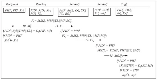 [Message 10] Once the recipient’s tag receives the encrypted messages from reader , the recipient’s tag decrypts the message to verify whether is correct. If the verification is successful, the recipient’s tag updates the current ownership by shared key with the new ownership by shared key , as shown in Figure 6.