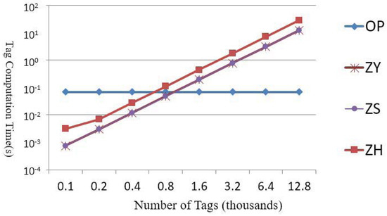 According to Figure 7, OP involves fewer than 800 tags, and a longer computation time is required because the group key must be decrypted. As the number of tags increases, the computation time increases because computing time and tag number are linearly related. When the number of tags exceeds 800, OP is more efficient compared to the other methods. The computation times of ZY and ZS differ by only 1%.