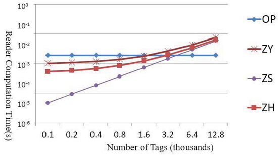 We use “OP” as an abbreviation for our proposed protocol; “ZY” represents the combination of Zuo [22] and Yen et al. [25]; “ZS” represents the combination of Zuo [22] and Sun et al. [24]; and “ZH” represents the combination of Zuo [22] and Hermes and Peeters [5]. Figures 8 and 9 show the readers with the maximum reading capacity of 200 tags employed to determine the computing times required by various methods. The number of tags starts from 100 and is doubled until it reaches 12,800.