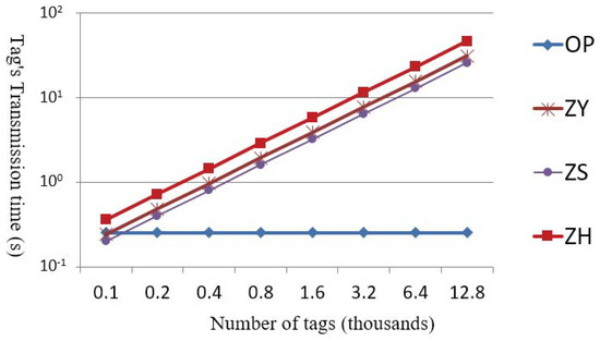 Table 6 presents a comparison of the transmission time of OP with those of the other methods. In OP, we adopted a multilayered grouping proof structure, and a maximum of r tags were distributed to each reader. Thus, compared to other methods, an increase in the number of tags did not lead to an increase in transmission from the tags to the reader. Furthermore, the transmission time from the reader to the tags increased by times because a read-tree was employed. ZY, ZS, and ZH could not manage m tags simultaneously; therefore, the transmission was repeated times when those methods were used.