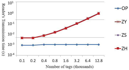 Figure 9 and Figure 10 show the required transmission times for the tags and readers. According to Figure 9, OP requires slightly more transmission time when fewer than 100 tags are involved. However, when the number of tags is more than 100, OP is more efficient compared to the other protocols, because the other protocols would need to divide the tags and transmit them over several cycles, thereby increasing the transmission time. Figure 10 shows that OP has the shortest transmission time from readers to tags because OP requires only one multicast to broadcast the messages to all tags, as opposed to the other methods, which require the messages to be transmitted multiple times.