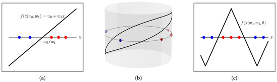 For directional data, the model has to be adapted, as it should be periodic, continuous, and naturally take positive and negative values in the circular domain (so it can aim to label positive and negative examples correctly). Arguably, the most natural extension of the linear model in is the piecewise linear model in ; see Figure 1b,c. Note that, now, the partition of the input space requires two thresholds.