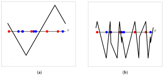 The Fourier series of the triangle wave has an infinite number of non-zero coefficients, and therefore, the classifier instanced with the triangle wave kernel has infinite VC dimension. On the other hand, the VC dimension of the classifier instanced with the cosine kernel equals three. Consequently, the SVM with the triangle wave kernel is able to express an arbitrary number of thresholds in the circular domain, unlike the SVM with the cosine kernel or with the triangle wave in the primal form, which, as proven before, can only express two thresholds in . Figure 2 illustrates these differences.