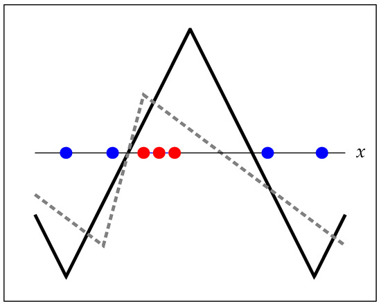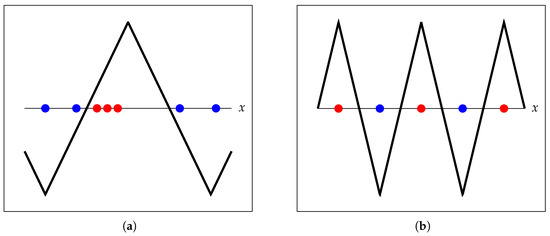 Having proven the validity of as a kernel, we now focus on investigating the expressiveness of the resulting SVM. The note made in Section 4.1 supports that the sum of triangle functions centered in fixed positions is not expressive enough since it cannot place the decision boundaries in arbitrary positions. However, the kernelized version in Equation (11) can still be appealing, since now, the models are centered in the training observations, and, as such, adapted in number and phase to the training data. For the purpose of this analysis, the notion of the Vapnik–Chervonenkis (VC) dimension [6], given in Definition 1, will be useful.