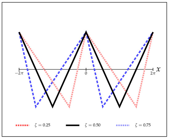 Here, controls the asymmetry of the wave: if , the wave has infinite ascending slope; if , the wave has infinite descending slope, and for , it coincides with the symmetric case, . The wave is depicted in Figure 5 for some values of .