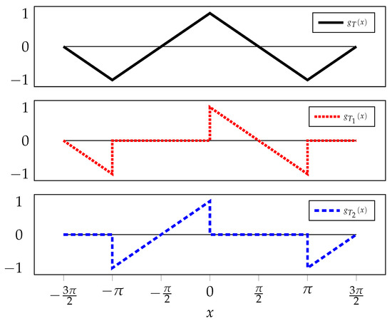 - , where is the triangle wave with unitary amplitude, period , and maxima at . This function is piecewise linear, and so, it is close to the linear version in the standard domain.