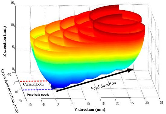 The machined surface topography is obtained by cross-calculation between the space motion envelope of the tool and Boolean of the workpiece. The space motion envelope of the tool can be expressed by Equation (10):