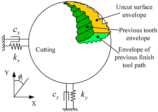 where , , , , , are vibration acceleration, vibration velocity and vibration displacement of the cutting system. , , , , , and are the mass, structural damping, and stiffness matrices of the cutting system in the x and y direction.