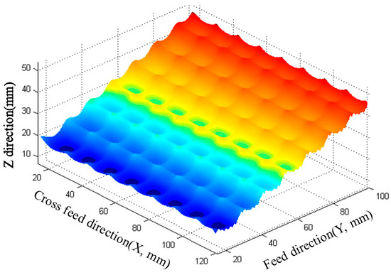 The Z-map method is used to predict the three-dimensional morphology of milling process in this paper. Firstly, the workpiece is discretized to get three-dimensional mesh points on the workpiece surface. Afterwards, the appropriate time step is selected to ensure that only one mesh point falls on a space surface swept by the cutting edge within the unit time step. Comparing the position relationship between the edge curve and the mesh points on the workpiece surface, the mesh points above the edge curve are discarded, and the coordinate value of the cutting edges discrete point Z is replaced by the height value of the corresponding mesh points in the workpiece discrete point H matrix. The three-dimensional surface topography is drawn by the H matrix after the cutting is completed. The detailed algorithm flow chart is shown in Figure 5. The surface morphology of the oblique-plane is shown in Figure 6.