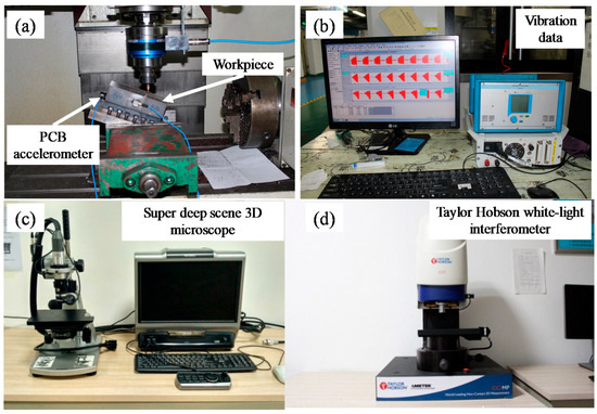 The VDL-1000E three-axis CNC (Computerized Numerical Control) machine tool produced by Dalian machine tool group (Dalian, China) was used. The solid carbide ball end mill is SH300-B2-10015-H produced by the Xiamen Golden Heron Company (Xiamen, China) with a diameter of 10 mm and the tooth number of 2. Cr12MoV hardened steel with 45 HRC (Rockwell hardness) hardness was selected as experimental material. A PCB accelerometer with sensitivity of 10.42 mv/g was used to collect the acceleration signals during cutting. The modal parameters of the milling system were obtained by modal tests with a sensitivity of 3.41 pC/N force hammer. An experimental site is shown in Figure 7. The tool flank wear states were observed by a super deep scene 3D microscope with VHX-1000(KEYENCE, Osaka, Japan), as shown in Figure 8. The surface morphology of the machined workpiece was measured by a Taylor Hobson white-light interferometer (Taylor Hobson, Leicester, UK) with a CCI Map. The experimental scheme is presented in Table 1.