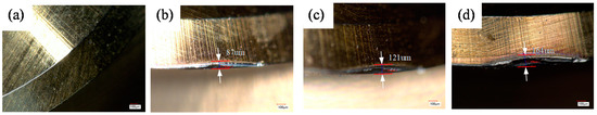 Ball-end milling cutters with different wear states (a) VB = 0; (b) VB = 87um; (c) VB = 121 um; (d) VB = 164 um. VB—the tool wear.