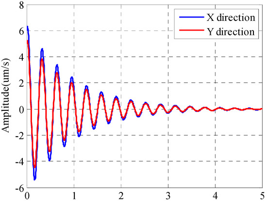 The simulation results of total cutting vibration with cutting parameters (Test 1) in the x and y directions are shown in Figure 11a,c. Cutting vibration obtained from cutting experiments is shown in Figure 11b,d.