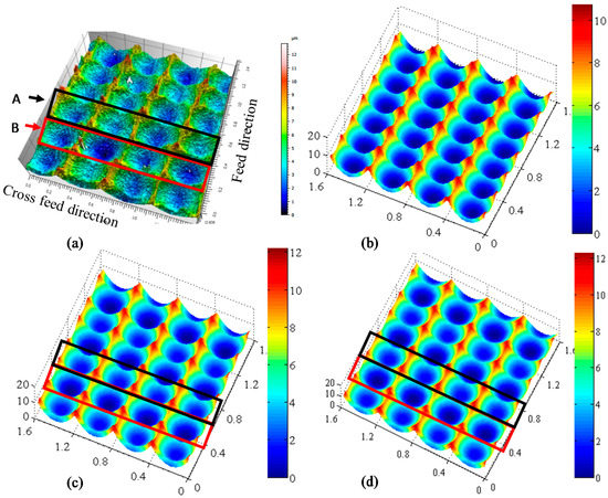 It can be seen from Figure 12 that the dynamic characteristics of the cutting system affect the texture structure of the machined surface. Due to the influence of cutting system vibration, the cutting contour of adjacent surface topologies in the feed direction is different, which is caused by the slight up–down displacement of the two edges of the ball-end milling cutter, as shown in Figure 12a. A is the surface profile formed when the vibration of the cutting system is maximum, and B is the surface profile formed when the vibration of the cutting system is minimum. It can be seen from Figure 12 b–d that, when the vibration of cutting system is considered, the surface topography obtained by simulation is closer to that obtained by actual machining process. Meanwhile, it is found that the impact vibration has little effect on the texture structure of the surface morphology but affects the scallop-height of the machined surface. The reasons for the difference in surface morphology between the simulated and experimental are as follows: (1) the cut-in phase angle is random in the experiment process; and (2) the surface topography model does not take into account the tool deformation. When the dynamic characteristics of cutting system are not considered, the simulation error of surface roughness is 19.05%. When only the vibration caused by a nonlinear change of chip thickness is considered, the surface roughness error is 12.09%. When the vibration of cutting system with cutting impact vibration is considered, the error of surface roughness is 9.52%.