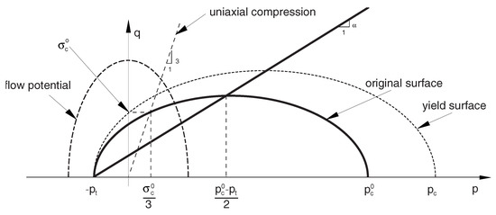 The yield surface represents the von Mises circle in the deviatoric stress plane and is an ellipse on the meridional stress plane, as depicted in Figure 2.
