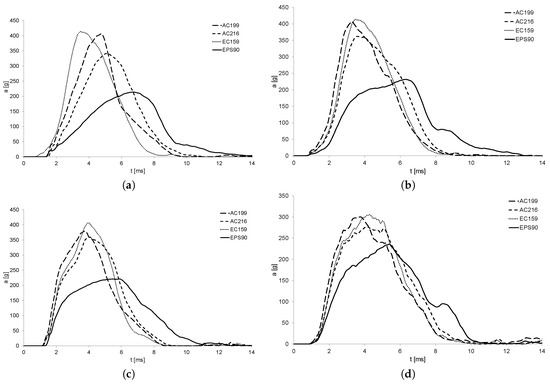 Acceleration measured in the headform’s COG - ECE 22.05 test conditions: (a) Impact point B. (b) Impact point P. (c) Impact point R. (d) Impact point X.