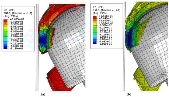 According to the ECE 22.05 standard, the helmet-headform system is dropped, without any restriction, against an anvil with a velocity of 7.5 m/s. Thus, the anvil is fully constrained, and an impact velocity of 7.5 m/s was prescribed to the helmet-headform model for all impact configurations (B, P, R, and X impact points). The Abaqus Explicit solver was used to simulate the impacts, with the large deformation option activated.