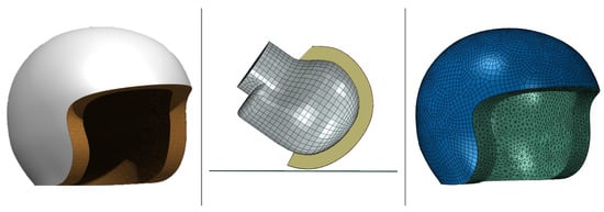 The same type of elements used to model the previous helmet were used. The meshes were created always avoiding distorted and warped elements. Additionally, special attention was given to the time increment, avoiding very small elements to have a reasonable computation time but at the same time a mesh refined enough to obtain precise results. Figure 6 shows the FE helmet mesh.