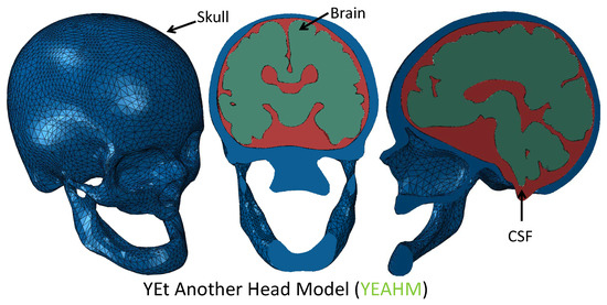 - Fernandes, F.A.O.; Tchepel, D.; Alves de Sousa, R.J.; Ptak, M. Development and validation of a new finite element human head model: Yet Another Head Model (YEAHM). Eng. Comput. 2018, 35, 447–496. [Google Scholar] [CrossRef]