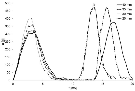 For impact point X, the results between cork agglomerates and EPS were closer (Figure 4). In this area, the liner has a thickness of approximately 40 mm. Another factor that may have contributed to the lower accelerations for this impact point is the larger impacted area.
