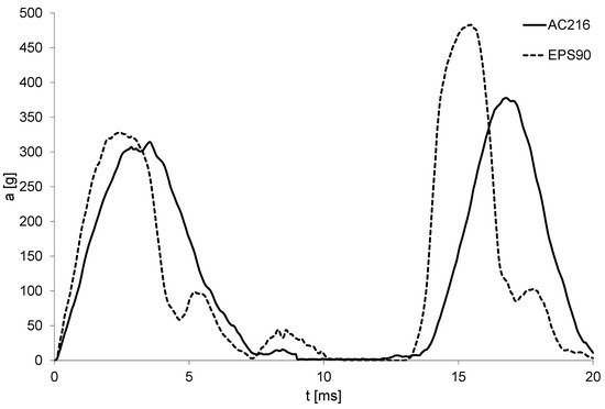 The helmets were tested according to the conditions required by the ECE 22.05 standard. Additionally, two impacts with the same conditions were performed. The impact point B was chosen because it is the most common impact. Statistics show that independently of the helmet type, this is the most impacted area [57,58,59,60,61,62,63,64]. In addition, in the previous section, this was the impact point where the EPS helmet had lower accelerations (Figure 4). On the other hand, at this impact location, the AC216 agglomerate version presented 50% of deformation for a thickness of 50 mm, not reaching densification (Figure 3 and Figure 5).