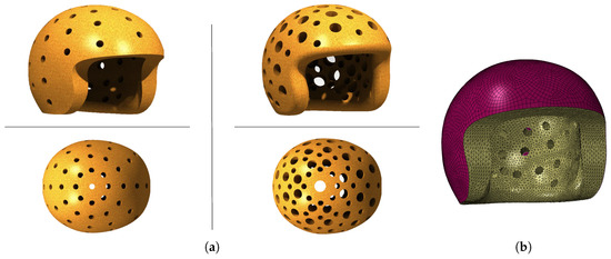 Lighter holed versions of the 40 mm thick cork liner: (a) Left—render of the 15 mm diameter-holed version; Right—render of the 25 mm diameter-holed version. (b) FE helmet model of the 15 mm diameter-holed version.