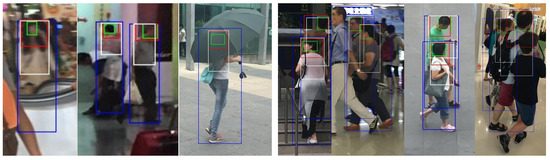Figure 7. Blue, white, red and green bounding boxes stand for correct pedestrian, upper body, head-shoulder and head detection by our full method, respectively. The black bounding box stands for the incorrect head detection results in ablation study by ‘Proposed w/o AJ-NMS’.