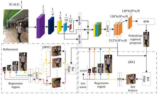 where L R P N _ c l s and L R P N _ r e g are pedestrian region proposals losses in RPN module, which are the same as that those in Faster R-CNN [7]. L B i C _ c l s is classification loss (cross-entropy loss) in classifying the pedestrian region proposals by the BiC module. L B i C _ r e g is the regression loss (smooth L1 loss [7]) for pedestrian, head, head-shoulder, and upper body regression in BiC module. Similar to L B i C _ r e g , L R e f i n e _ r e g is also a regression loss in regressing four body parts by the Refinement module. We set the hyper-parameters of the loss function λ 1 , λ 2 , λ 3 , λ 4 , and λ 5 to 1, 1, 0.25, 0.25 and 0.25, respectively.