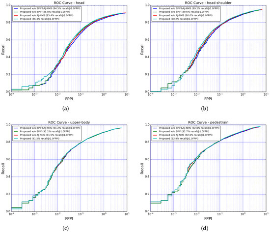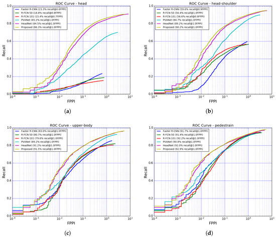 Figure 4. Detection performance (in terms of recall vs. FPPI) by the proposed approach and the state-of-the-art methods on the CUHK-SYSU Person Search Dataset. (a) ROC curve for head detection, (b) ROC curve for head-shoulder detection, (c) ROC curve for upper body detection, and (d) ROC curve for the holistic pedestrian detection.