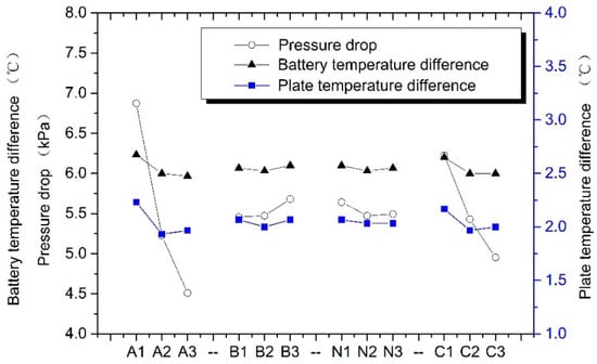 | Test Number | A | B | N | C | Pressure Drop, kPa | Battery Temperature Difference, °C | Plate Temperature Difference, °C |