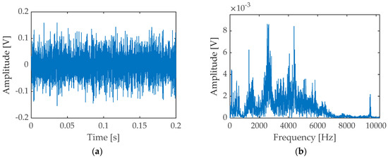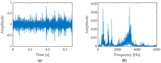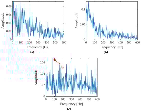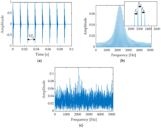 Theoretically, once the rolling bearing has a localized fault (such as pitting, spalling, etc.), which creates the periodic impulses during the rotation of rotor, the periodic resonance of structures can be excited in the vibration signal. Thus, the frequency of the transient oscillation is decided by the natural frequency of the mechanical system, and the repetition frequency of the transient oscillation corresponds to the fault-related impulses [4]. The periodic vibration response signal is clearly non-stationary because the magnitude of oscillations decreases exponentially, and the signal having a discretized spectrum and wide frequency band of the high rotational speed of bearing is shown in Figure 1a,b. The discrete interval of frequency is the repetition period of the impact excitation. However, in incipient stages, due to the lower amplitude of the transient oscillation, the large noise and other components often interfere with the identification of discrete frequencies [5], as shown in Figure 1c. Therefore, the feature extraction of periodic impulses is proposed with various detection methods, such as spectrum analysis, cepstral analysis [6], envelope analysis, and time–frequency analysis.