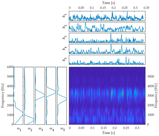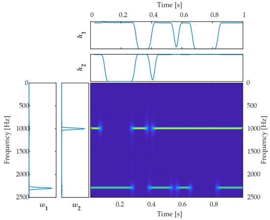 Figure 2 depicts the correspondence between wi and hi. The original signal shown in Figure 2 is mixed with the two non-continuous sinusoidal components of f1 = 1000 Hz and f2 = 2300 Hz, where the component of f1 contains three non-zero segments and the component of f2 contains four segments. Applying NMF with r = 2, two spectral bases and two time weight vectors are obtained from the TFD of the original signal. It can be clearly seen that w1 and h1 are the descriptions of the sinusoidal signal of frequency f1 in the frequency domain and the time envelope respectively. Likewise, the sinusoidal signal of the frequency f2 is described in both the time domain and the frequency domain by the basis w2 and the weight vector h2. Therefore, NMF on a spectrogram is a powerful method to describe each transient oscillation and its position in time with a set of spectral bases and weights.