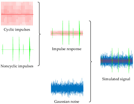 The exponentially decaying component usually indicates a localized fault in rolling bearings or external excitation, such as electromagnetic interference. Ak is the amplitude of impulse. T is the period of impulse, fh = 1/T is the fault feature frequency, fk is the natural frequency and Bk and φk are the damping ratio and phase respectively. It is obvious that the vibration response excited by a bearing fault is periodic. The second item of Equation (16) corresponds to the rotor fault, which is represented by the frequency harmonic component fo. Pm is the amplitude of the harmonic, and the last item n(t) is Gaussian white noise.