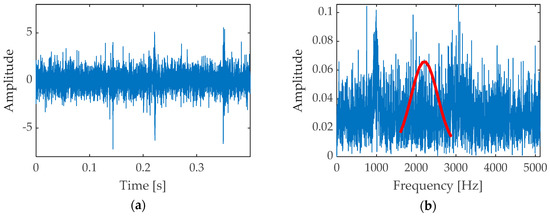Considering the low frequency position for the rotor harmonic fault, the impact excitations are only computed in an experiment. The outer ring fault-related frequency fh is set to 80 Hz, and the excited natural frequency is set to 2200 Hz. Meanwhile, three non-periodic transient oscillations are added, where the carrier frequencies are 1000 Hz, 2600 Hz and 3000 Hz, and the fractional bandwidths are set to 0.1, 0.3 and 0.1. The phases are all zero. Finally, the Gaussian white noise with signal-to-noise ratio (SNR) = 0 is added, and the vibration response signal is sampled at 10,240 Hz. The components of the simulated signal are described in Figure 3, and its waveform and spectrum are shown in Figure 4, where the red line denotes the envelope of the valid fault component. In Figure 4, because of the strong background noise and the random transient interference, it is difficult to directly observe the impact response caused by the local fault and its frequency component.