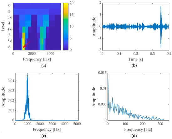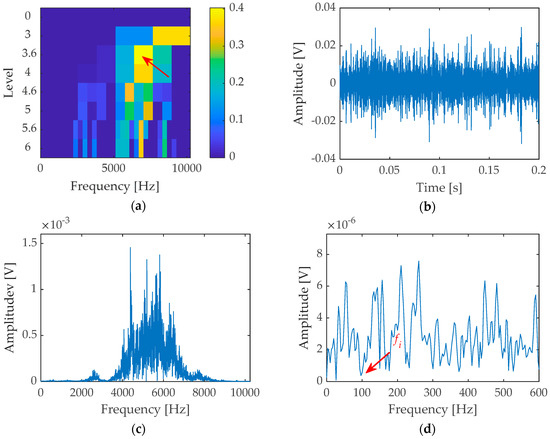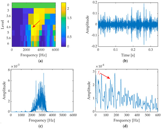 Fault characteristics extracted by the fast spectral kurtosis method: (a) Kurtogram of the simulated signal, the global maximum is achieved for Hz and Level = 6; (b) Waveform of the filtered signal; (c) Spectrum of the filtered signal; (d) Envelope spectrum of the filtered signal.