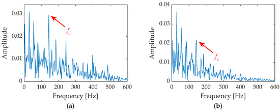 The fault of the inner ring bearing numbered 277DE, marked as “P”, is adopted for identification. The sensor for 277DE data is located at the motor driving end, and far from the fan end of the fault bearing, which means the test signal is coupled with a large amount of interference components. The analyzed data set consists of 4096 sampling data with a sampling frequency of 12 kHz, and its waveform and frequency spectrum are shown in Figure 10. According to the structural parameters of the bearing and the rotation speed, the characteristic frequency of the fault bearing is fi = 142.9 Hz. In the frequency spectrum of Figure 10b, distinct frequency bands can be observed except for the harmonic frequency of the rotation speed, and the high frequency region is located in the range of 1900–4000 Hz.
